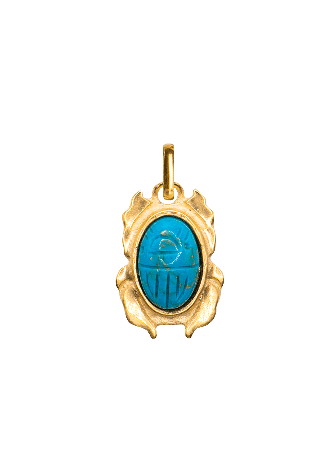 Colgante bañado en oro con escarabajo turquesa. El escarabajo significa vida y poder. Fue un amuleto importantísimo en el antiguo Egipto. En vida nos proporciona poder y protección frente al mal y da fuerza y poder a quien lo porta. Era tan fuerte esta creencia que los escarabajos gozaron de estatus sagrado en el antiguo Egipto. Incluye nuestra cadena Creta. Todo está bañado en oro de 18k para que te dure más tiempo como el primer día.