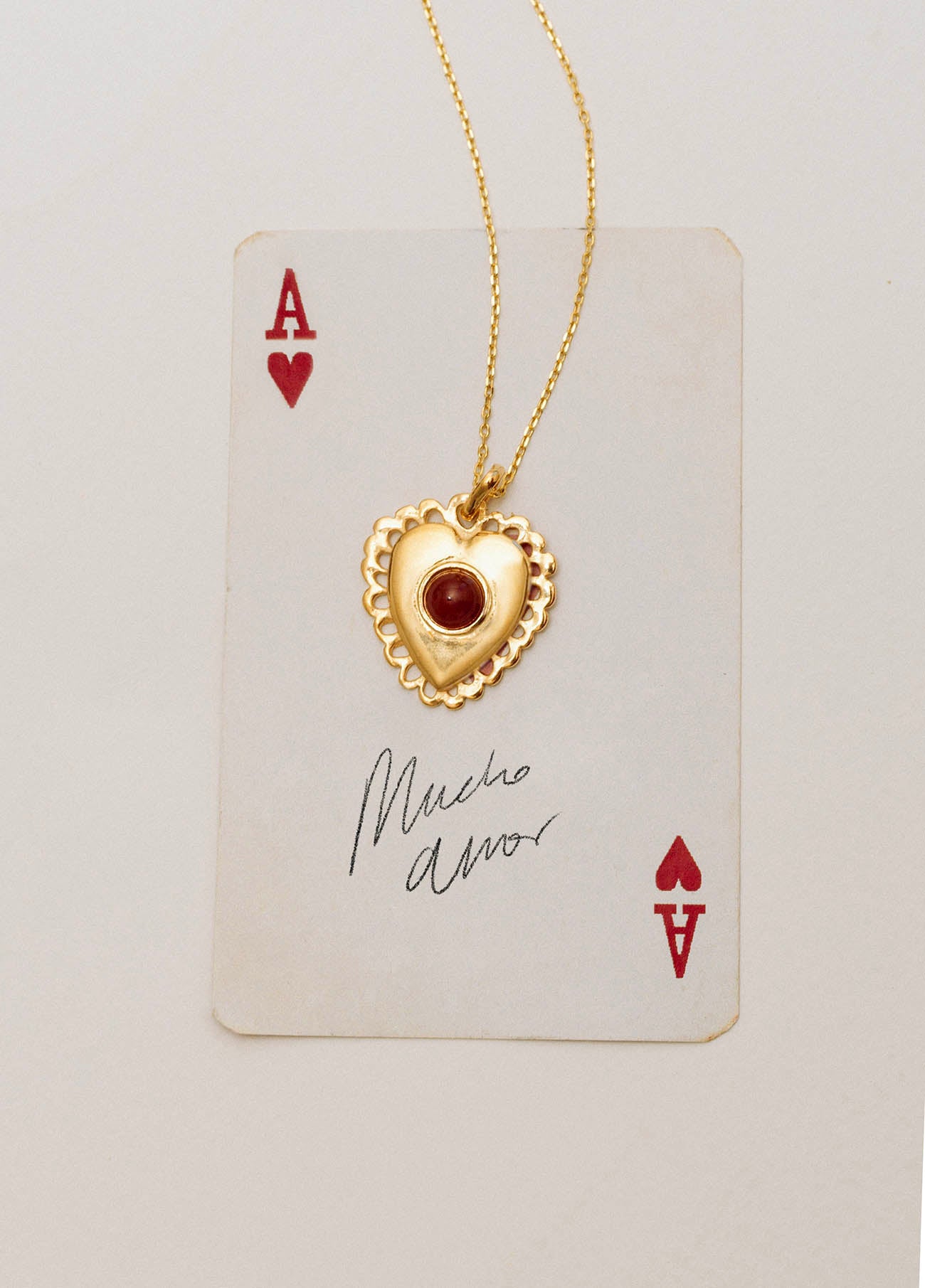 Corazon necklace is a very romantic heart-shaped necklace with a garnet agate stone plated in 3 microns of 18k gold. The color dark red is a very powerful color associated with passion and intense emotions. For Mediterranean cultures, love stories are strongly linked to passion and that is why our heart combines romanticism and passion in its design. Includes a delicate 44 cm or 55 cm chain.
