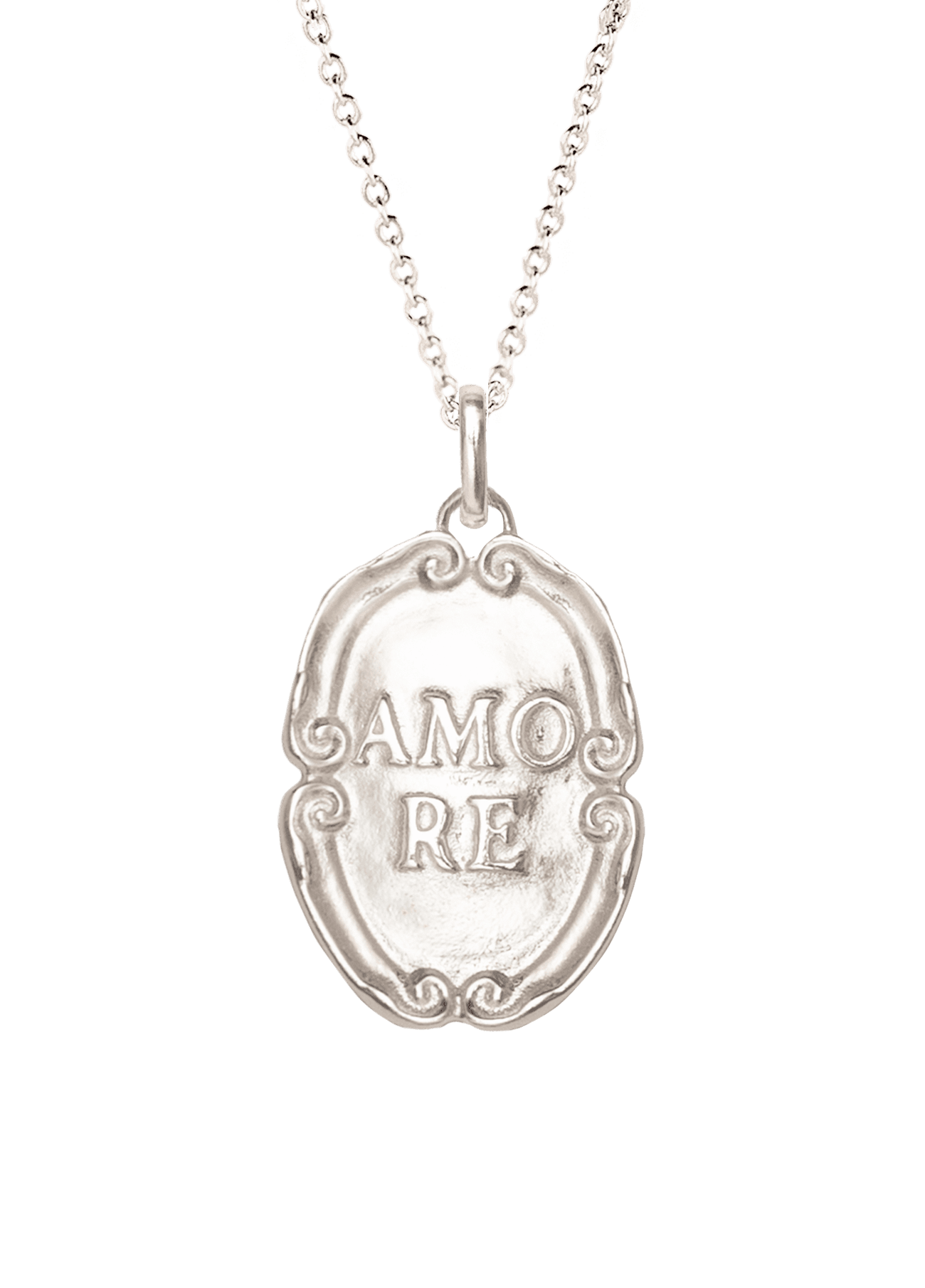 Amore Medal Necklace, is a necklace with a baroque-inspired medal with a romantic Italian word: Amore. It is made entirely of 925 Silver and is a nice gift for the Amore de la tua vita or for yourself. This special design includes a delicate silver chain.