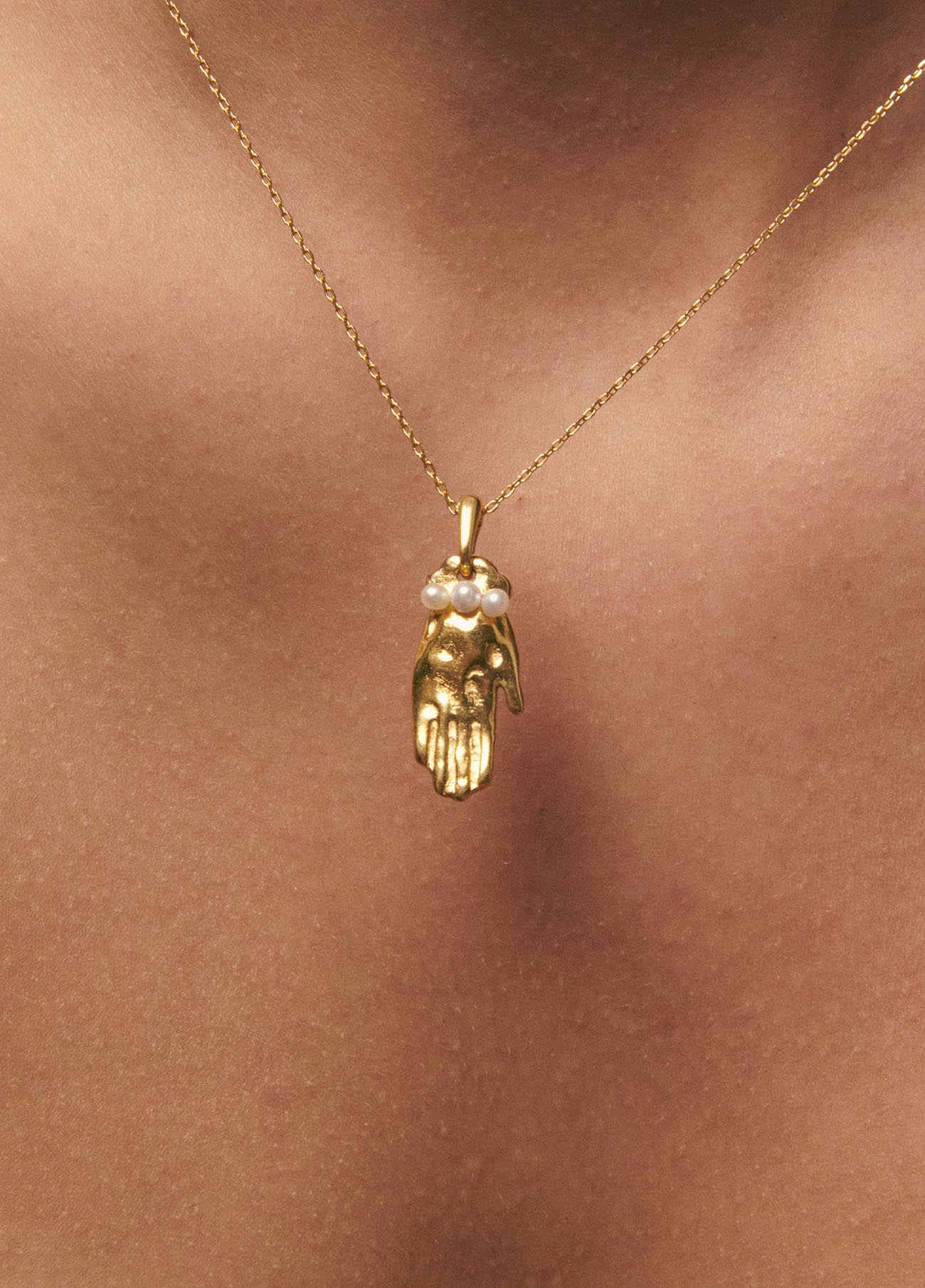 The Fátima necklace is a little hand with a bracelet of irregular cultured pearls on top. The surface of the hand is rough and matte gold plated, giving it that vintage look. It is not a typical hand of Fatima, it is our interpretation of this well-known symbol to prevent the evil eye. It is typical of Arab culture but what many people do not know is that it is also a symbol that Jews and Christians have in common. Includes a delicate 44 cm or 55 cm chain.