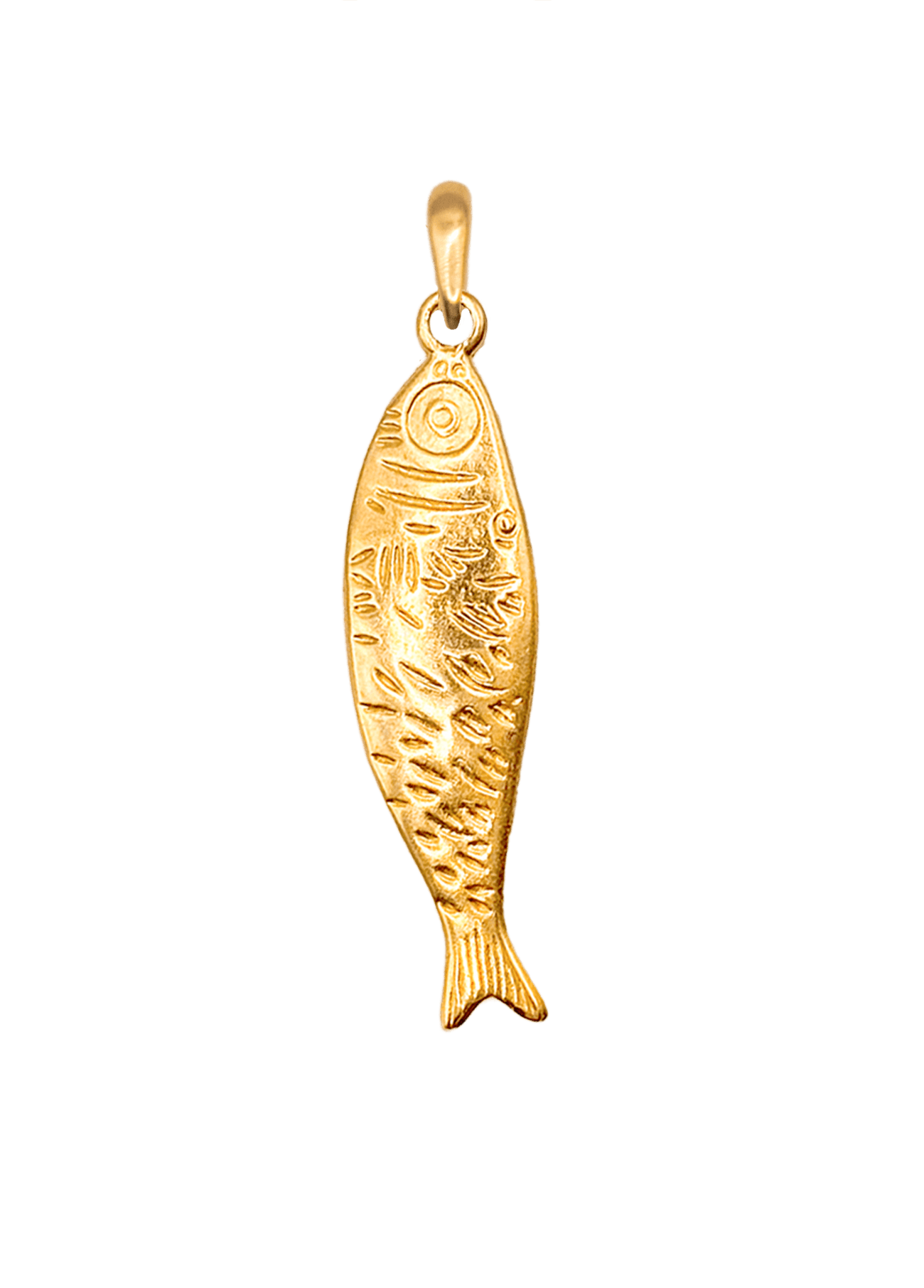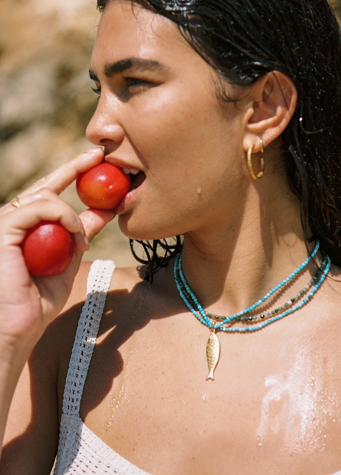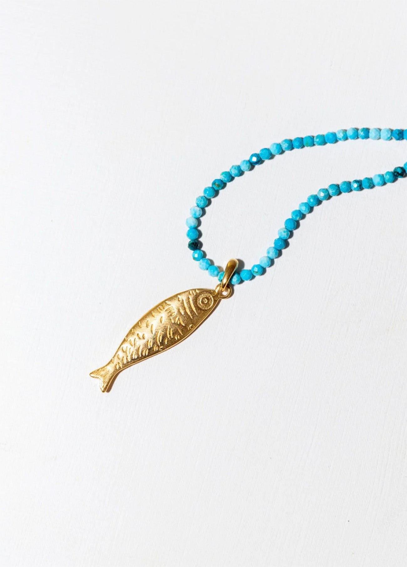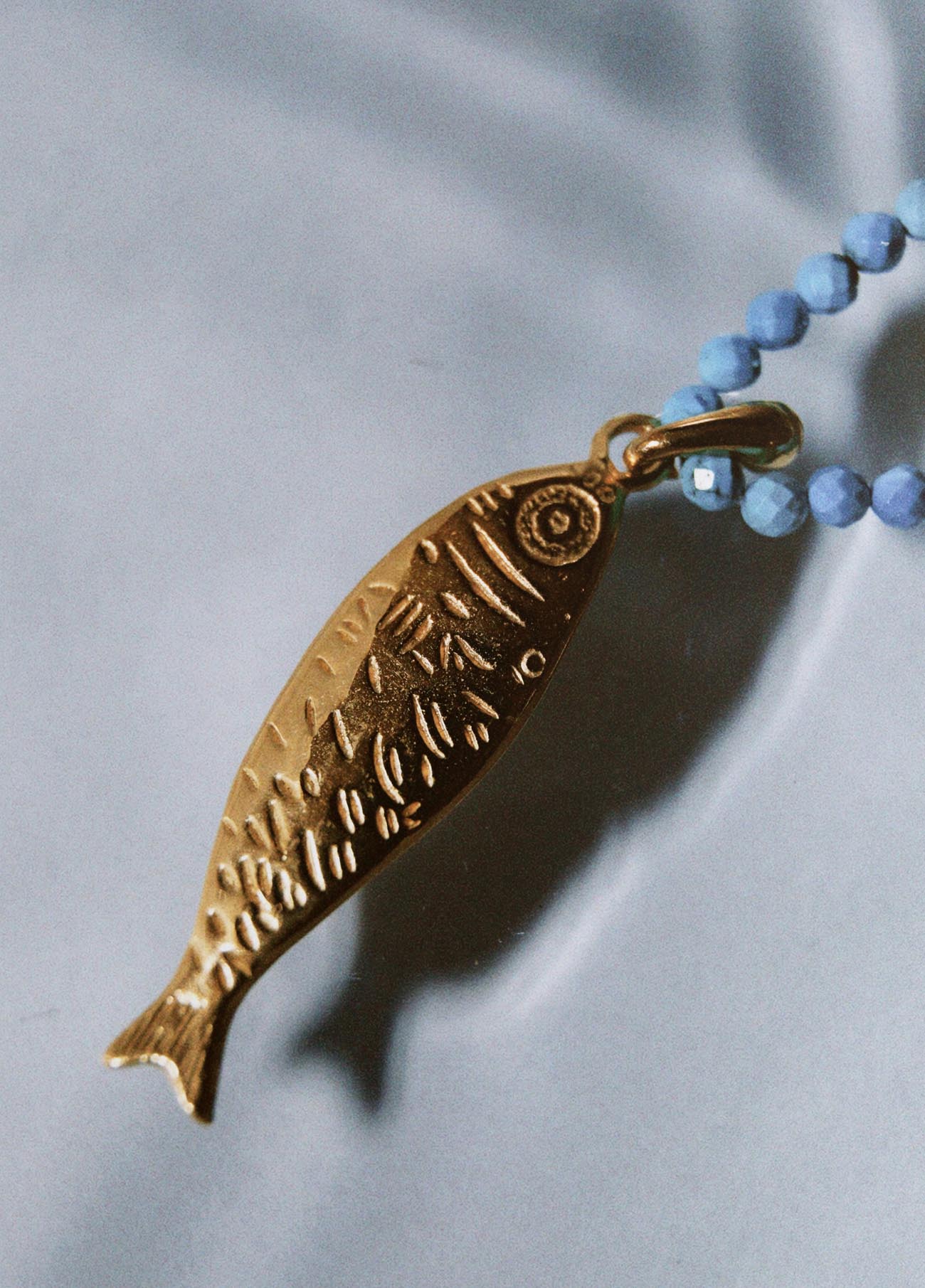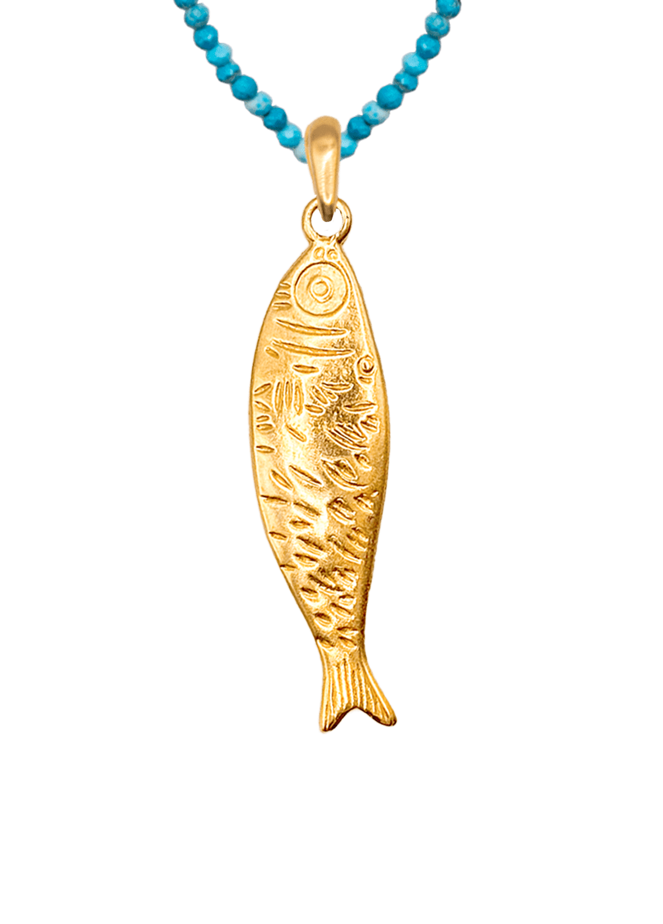 Sardina amulet charm with turquoise choker. The fish has several meanings, for symbolists it constitutes the beginning of everything, water, and is also identifying the Mediterranean culture, plated in 18k gold. Includes a very thin carabiner so you can use it as a handle and insert it into a chain, or hang it from chains with larger links, like our Creta chain.
