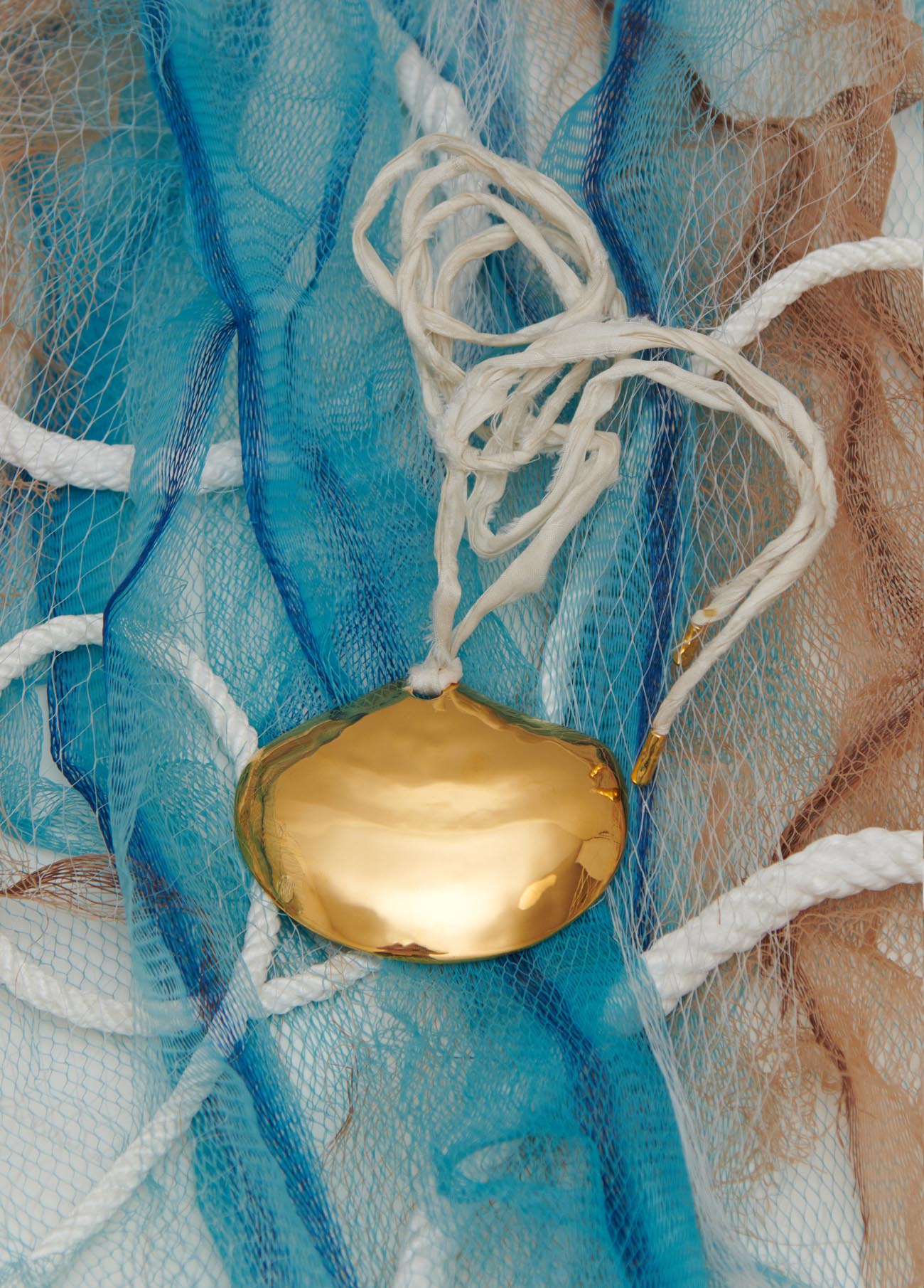 The Salitre pendant is inspired by the shell as a symbol of refuge and origin of the sea. Its sculptural shape transforms this natural element into a large piece, one of the most iconic in the collection, gold-plated and marked by the essence of the ocean. Includes clasp.