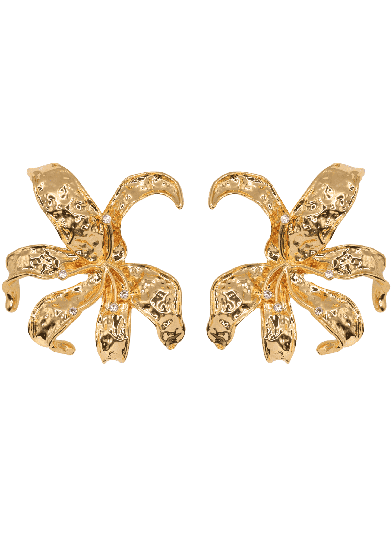 Pair of organic flower-shaped earrings in orange gold and embedded with cut crystals. They completely surround the ear and are called Rufina, who along with Santa Justa is one of the protectors of the Cathedral of Seville and the Giralda of Seville.