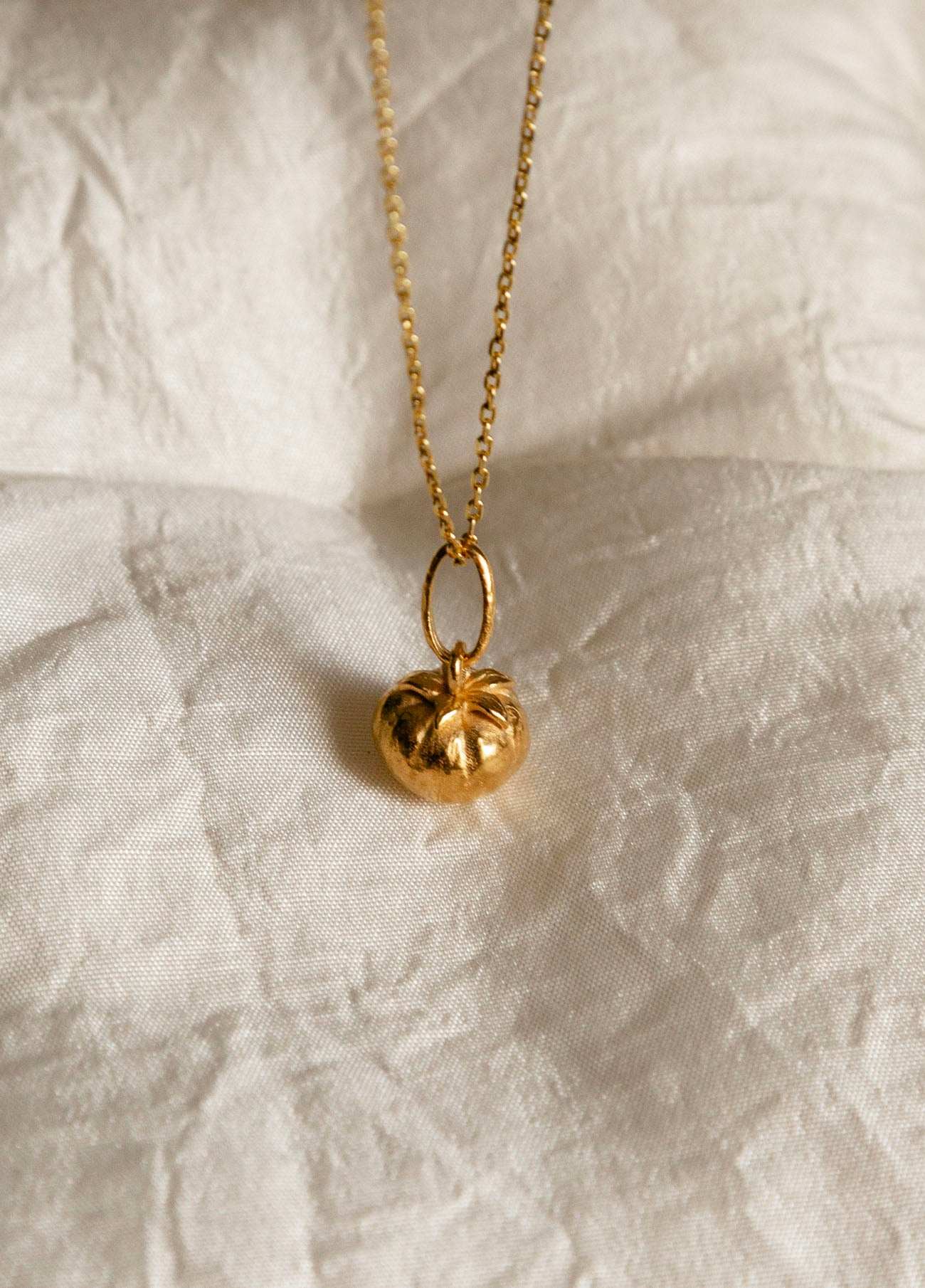 Este colgante con forma de tomate rinde homenaje al clásico fruto de la mesa española. El tomate nos conecta con la naturaleza y la tierra. Plasma su perfecta forma redondeada, el jugoso brillo de la fruta original y lo transforma en un pequeño tesoro para toda la vida.