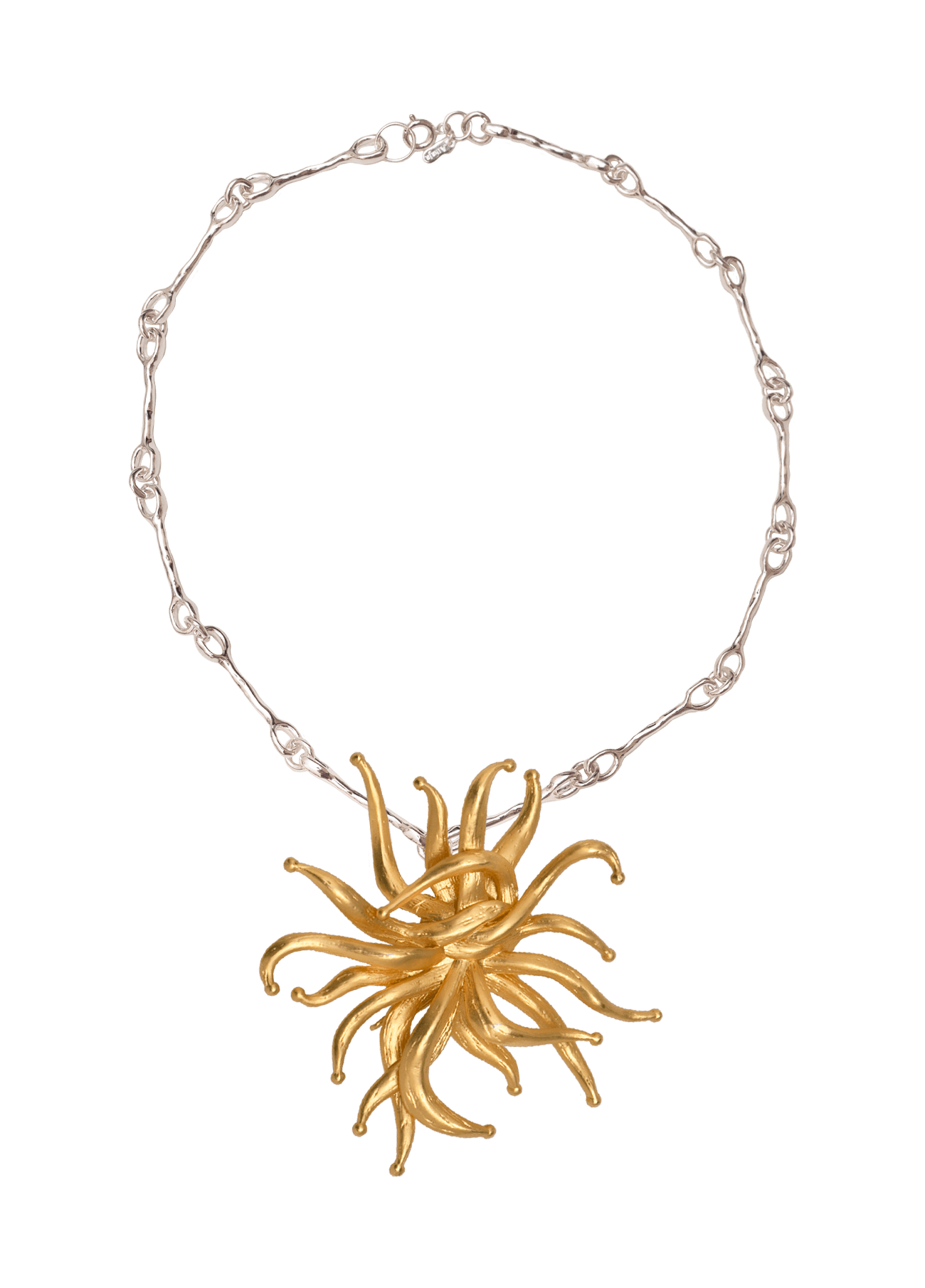 Su cadena Nautilus, de eslabones irregulares ensamblados a mano y elaborado en plata 925, evoca el movimiento del mar y la armonía orgánica de la costa.