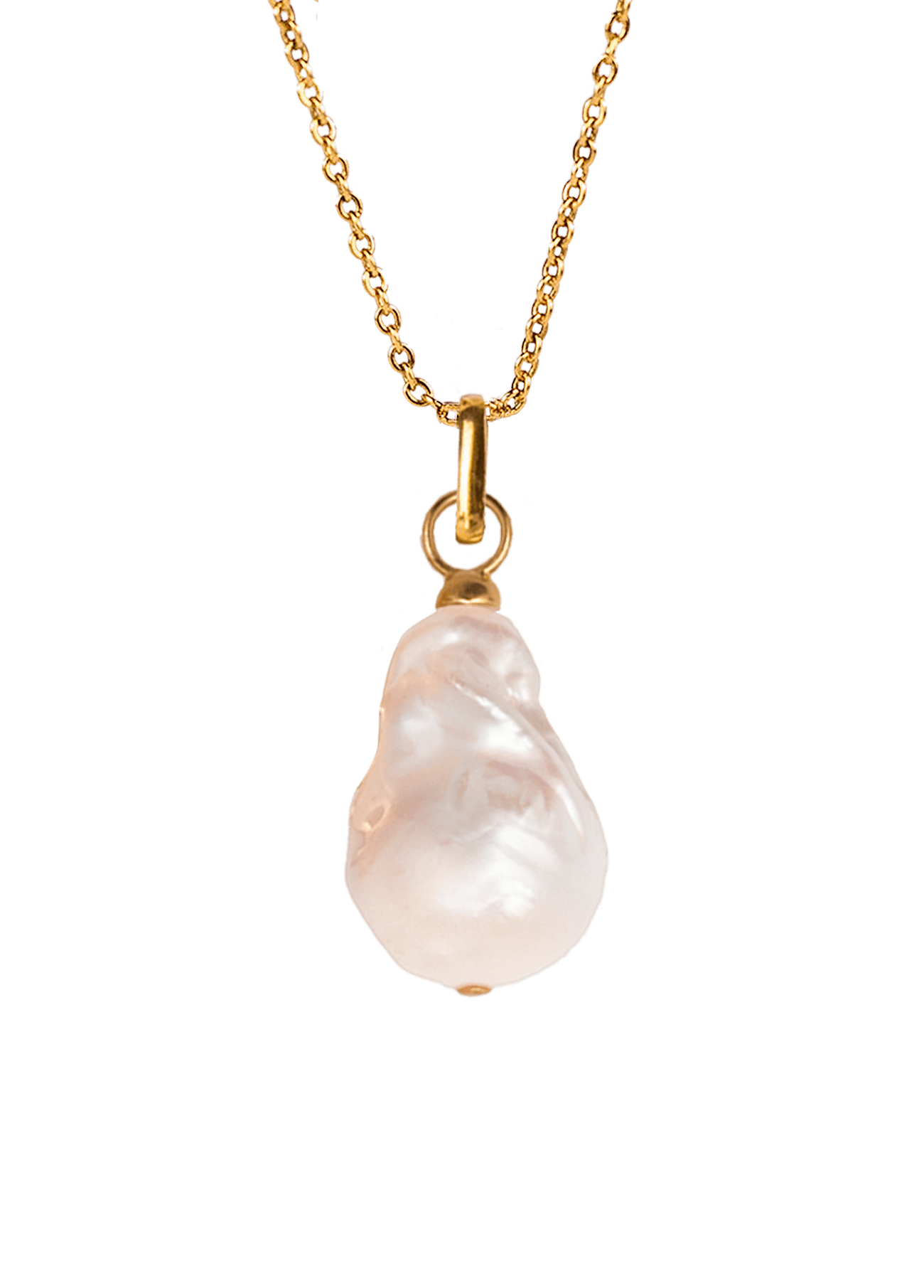 Collar con delicada perla cultivada, de forma irregular. Es un colgante muy ligero e ideal para combinar o llevar sola. Puedes además combinarlo con los pendientes Lolita River Pearls. Incluye una fina cadena de 44 cm o de 55 cm. Todo bañado en oro de 18k.